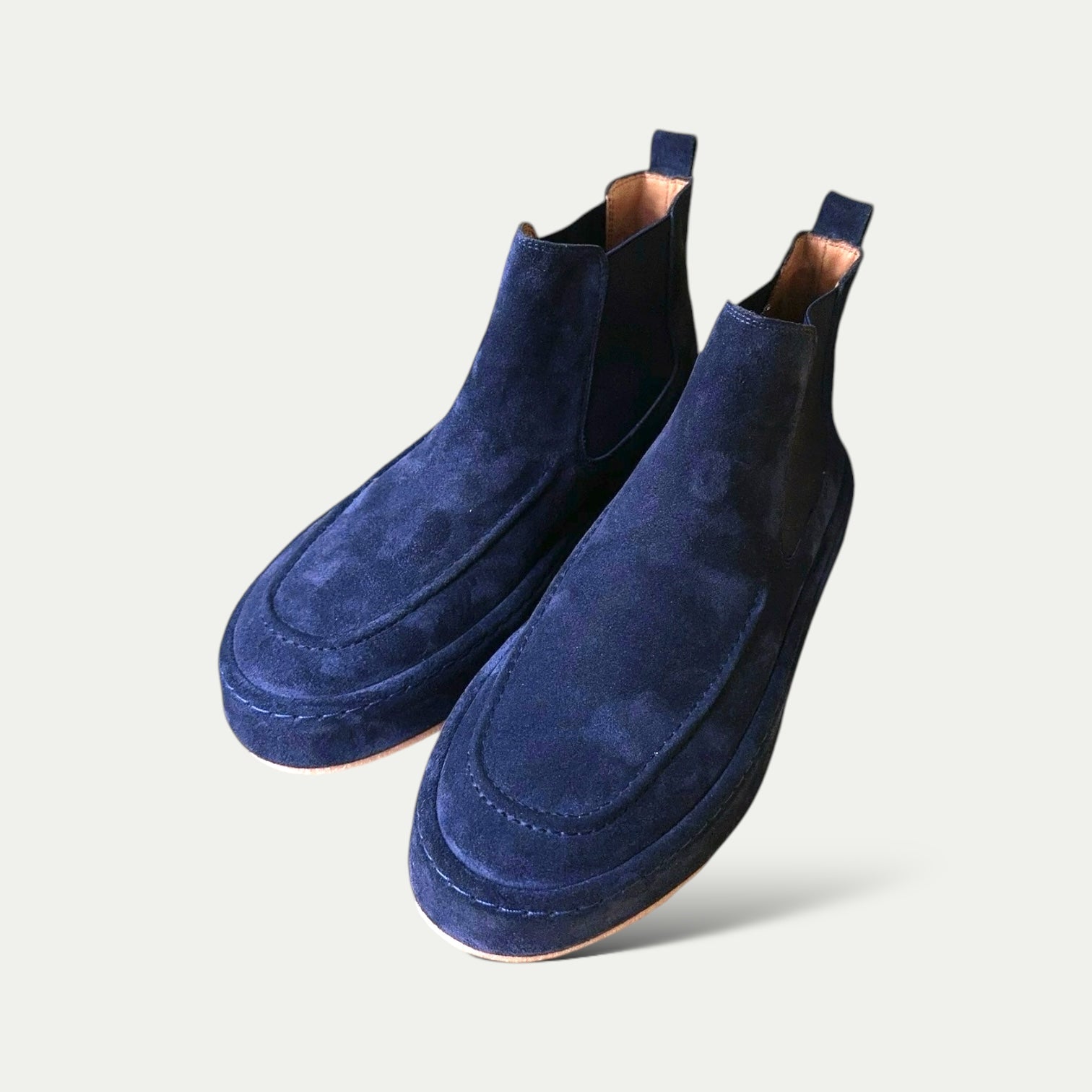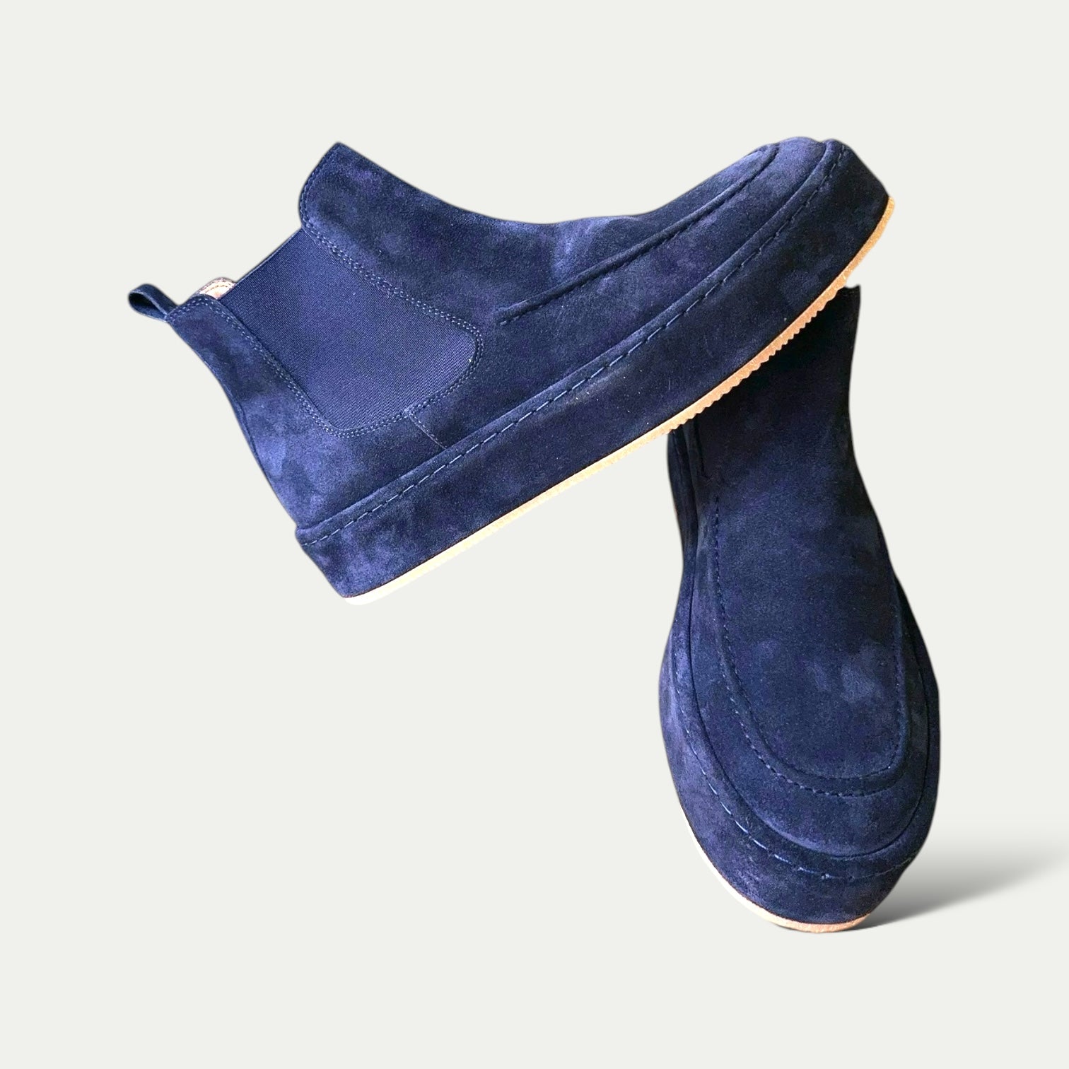 Ajoutez une touche de sophistication à votre style avec ces bottines en daim bleu marine, conçues avec un soin particulier pour les détails. Inspirées par le raffinement du design italien, ces bottines allient élégance et confort pour vos tenues décontractées ou habillées. Le daim de haute qualité leur confère une texture luxueuse, tandis que la semelle robuste assure une longue durée de vie et un confort optimal. Leur style minimaliste et moderne, agrémenté d’une bande élastique sur le côté, offre un enfilage facile et un maintien impeccable.
