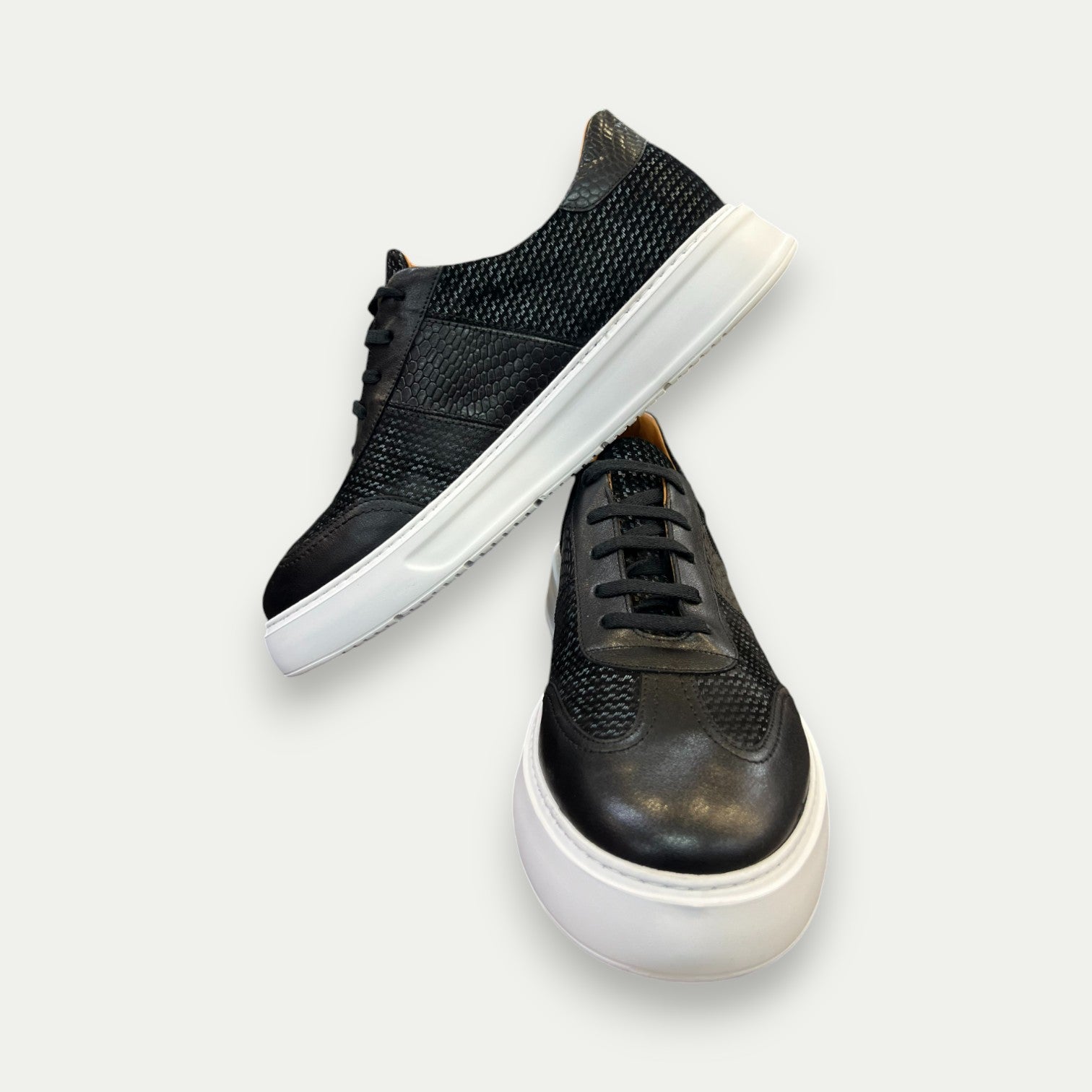 Ces sneakers en cuir et daim imprimé sont les chaussures parfaites pour toutes les occasions. Avec leur design ultra léger et leurs semelles en caoutchouc, elles offrent un confort ultime tout en gardant une allure sport chic. Leur couleur noire intemporelle et leurs lacets en font un choix élégant et pratique.