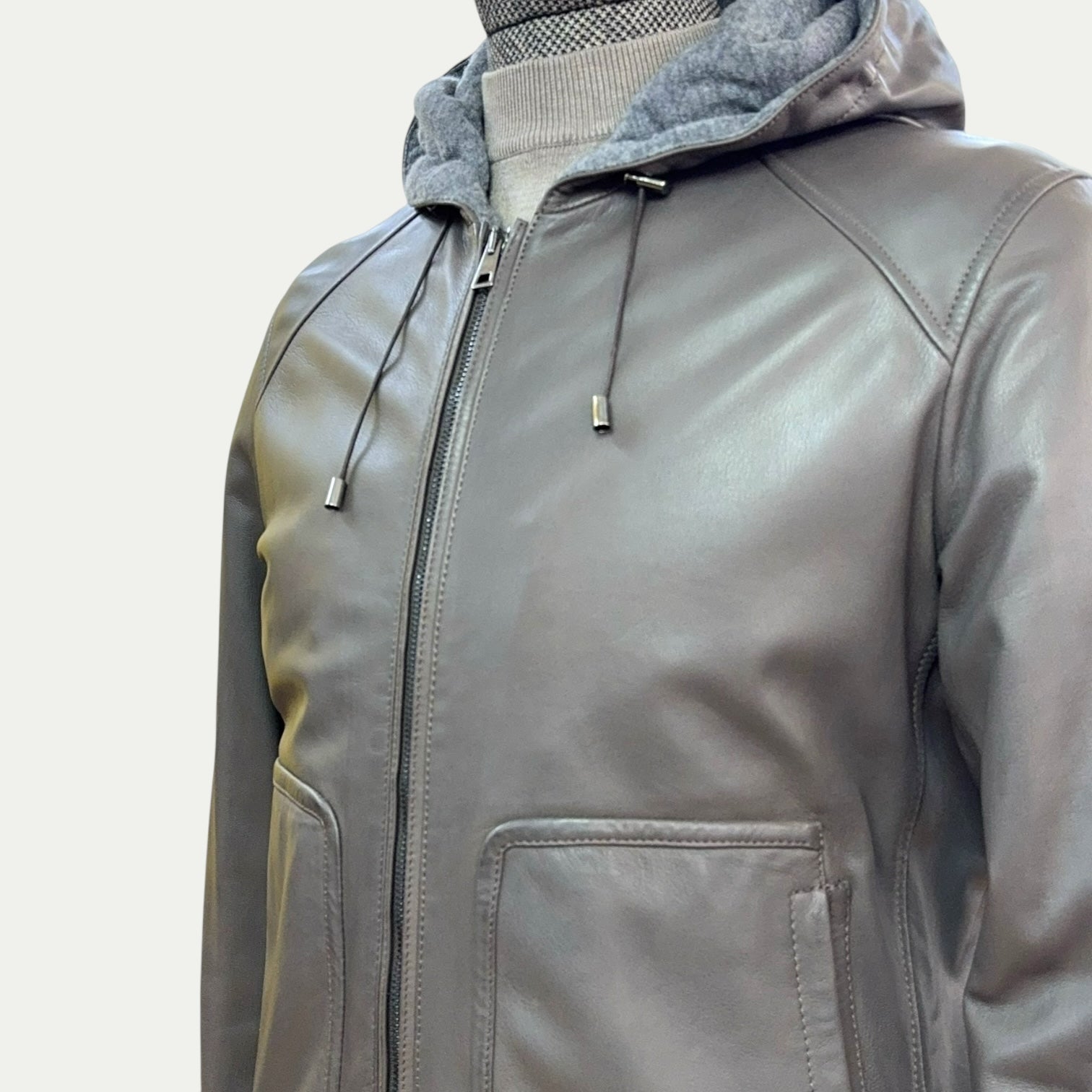 Ce blouson en cuir d’agneau très souple de la maison Gallotti se distingue par sa couleur unique, un mélange de gris et de marron qui tire vers un ton mastic subtil et sophistiqué. Parfait pour un style urbain moderne, il combine la légèreté et la douceur exceptionnelle du cuir d’agneau avec une coupe contemporaine et polyvalente.